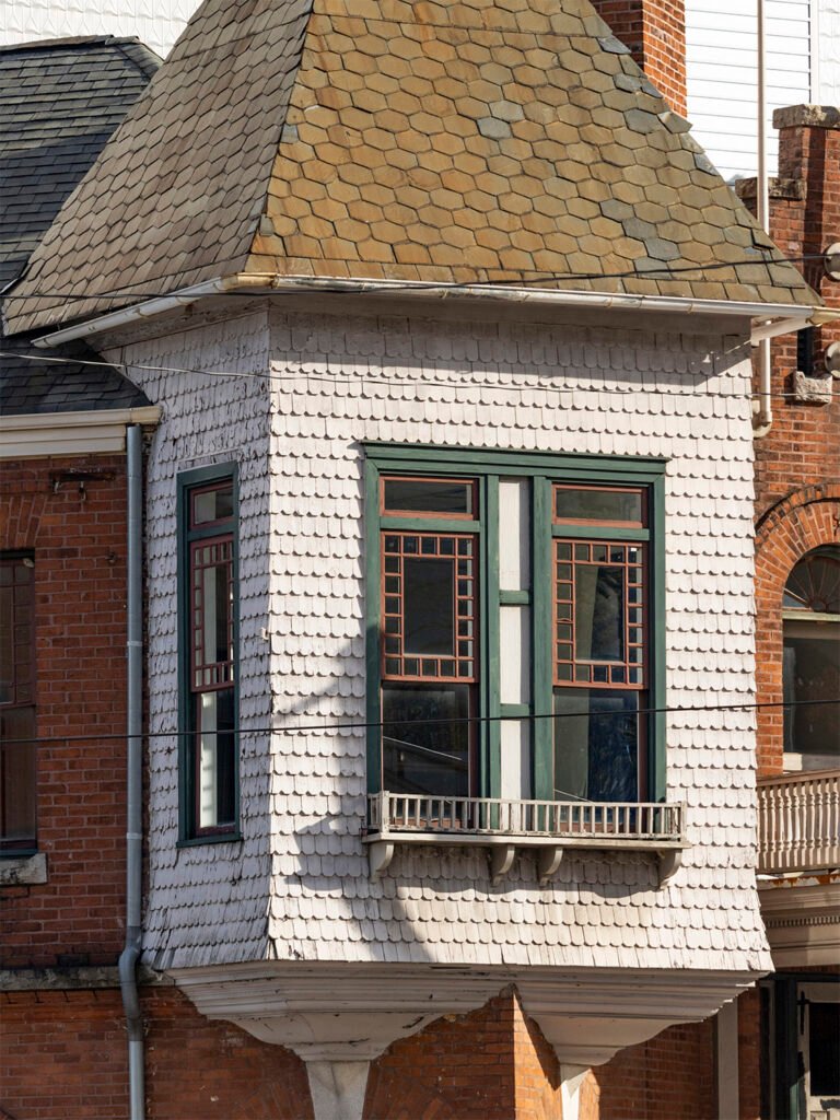 The fish-scale shingles used in both the turret and balcony were incorporated into Norrman’s designs for the McGowan House, and the T.P. Ivy House (1895) in Atlanta, among others.