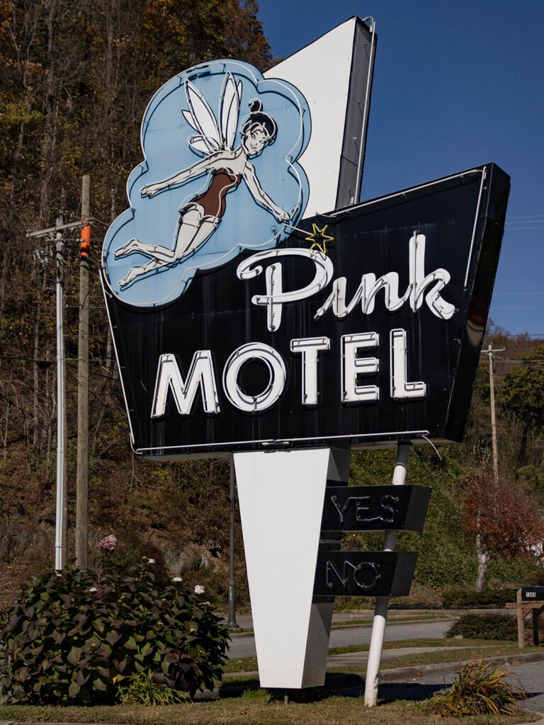 This sign in Cherokee, North Carolina, debuted at the Pink Motel’s opening in 1957. And if you’re wondering about the origin of the name, a newspaper report from the time helpfully explained: