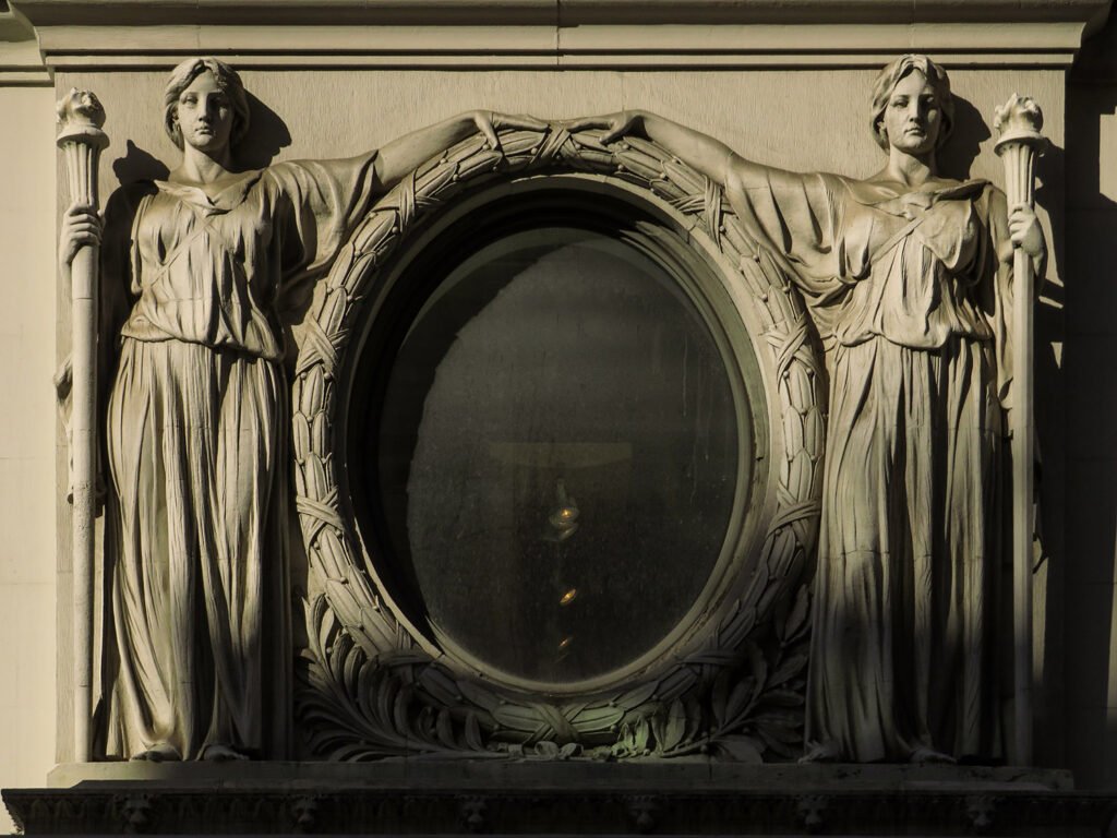 My favorite part of the exterior is the classically-inspired sculpture of two robed women guarding the portico on the east facade, designed by J. Massey Rhind.8