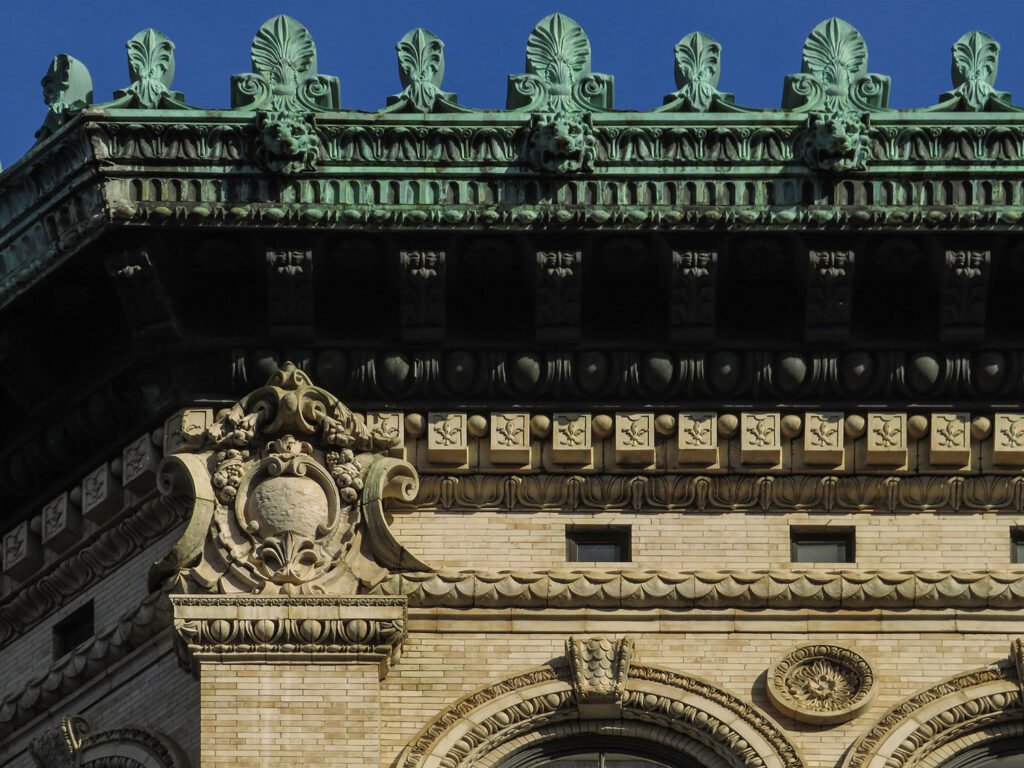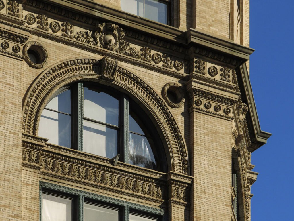 The building’s exterior was originally faced with Indiana limestone on the first and second floors, and the upper floors are covered in yellow brick and striking ornamental terra cotta,3 topped by an elaborate copper cornice.