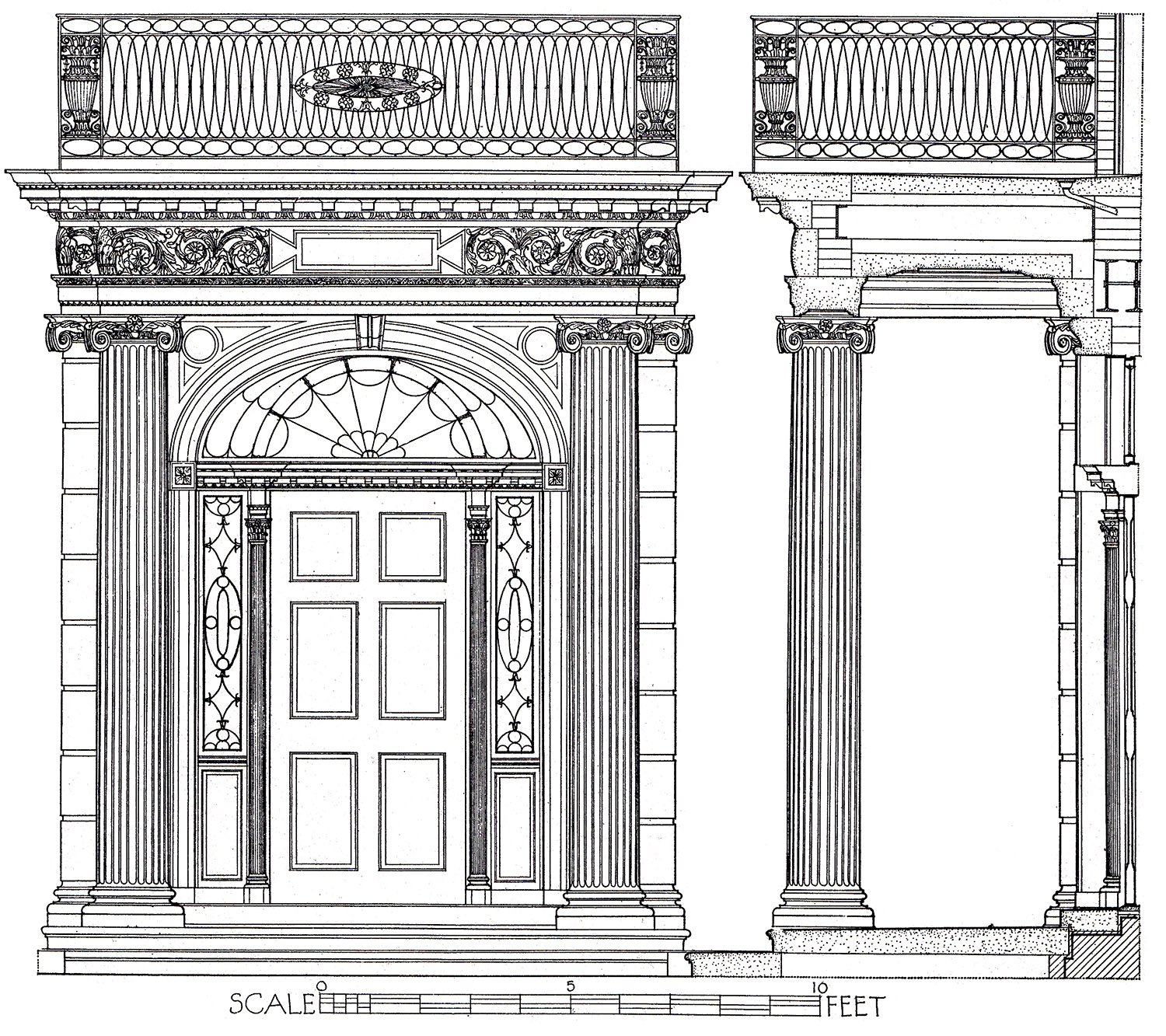 Neo-Federal in style, the Pyne residence balances a simple composition with refined touches, including a richly ornamented cornice, finely detailed consoles, an entrance portico with an elaborate frieze, and a series of blind arch windows on the second floor, one of them filled with marble and topped by a sculpted garland in its lunette.