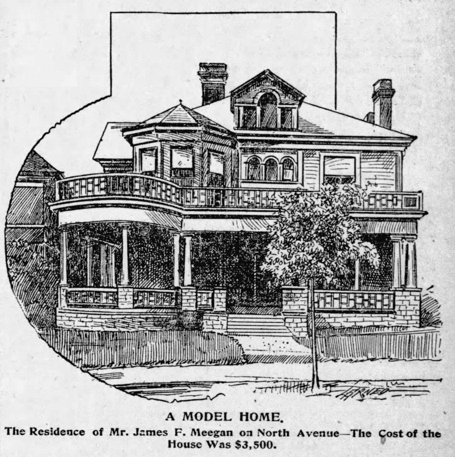 Accompanying this article are the front view and two floor plans of the residence of Mr. James F. Meegan, on North avenue. The house is one of the prettiest on that street, and since its erection last spring has been greatly admired. The plans are the work of Bruce & Morgan. The building was designed for a 50-foot lot. On the first floor there are the parlor, sitting room and library, on the right.