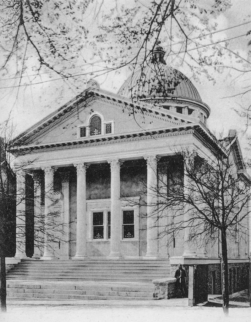 Unitarian Church of Our Father, built 1883 and demolished 1900 for construction of Carnegie Library – SW corner of Church and Forsyth Streets, Atlanta [Map]