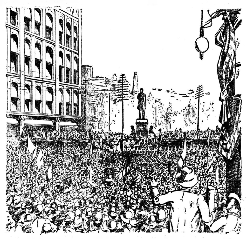 Illustration of the unveiling of the Henry W. Grady Monument, October 21, 18912 Americans love to deify racist orators, and when Grady suddenly died in December 1889, he was immediately beatified by White Atlantans as some patron saint of the city. A movement quickly grew to erect a monument to him, and in March 1890, a local committee accepted the design for a bronze statue sculpted by Alexander Doyle.3