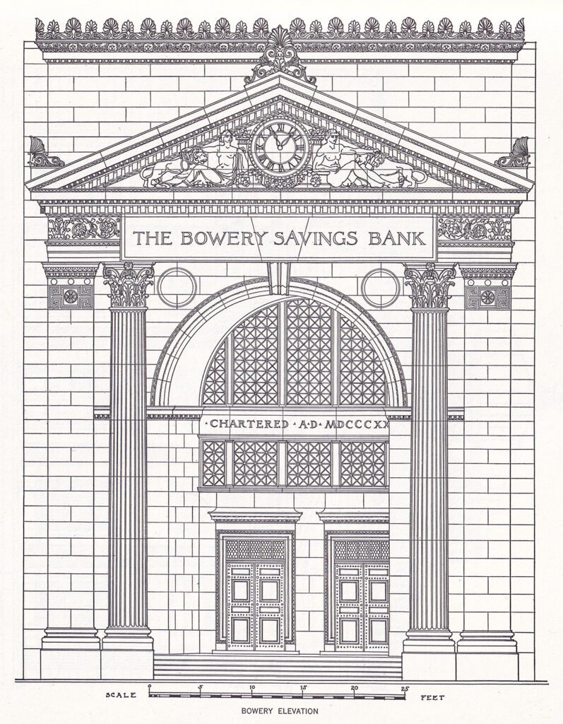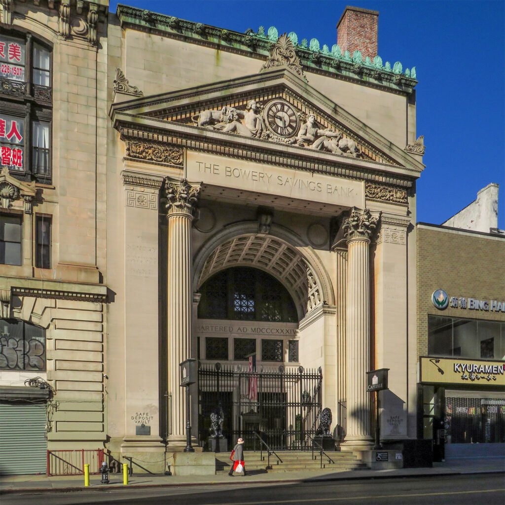 The Bowery Savings Bank is a significant early work in the Classical Revival style, credited to Stanford White of McKim, Mead & White.