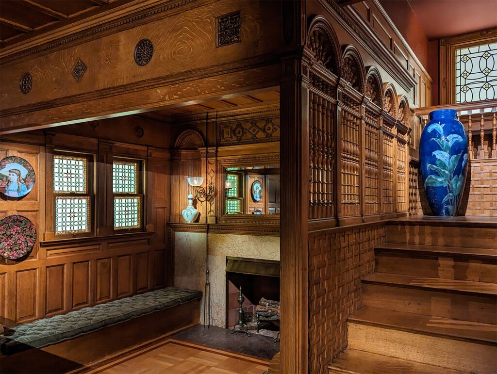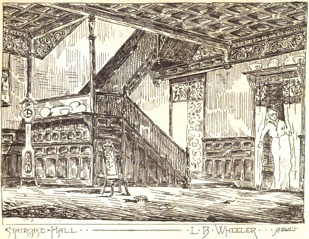 Having previously practiced in New York, Wheeler would have been very familiar with the living hall concept, as indicated by an 1882 illustration of a similar “staircase hall” he designed (pictured at top).