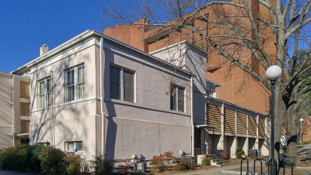 Tucked in a dark corner of the campus near South Lumpkin Street, the structure was designed primarily as a dining hall containing two adjoining 1,296-square-foot dining rooms, and initially accommodated 144 students.1